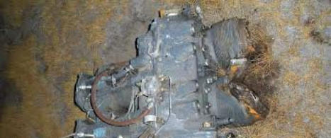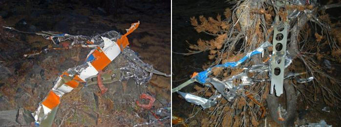 Zona de montañas donde sucedió la catástrofe y restos de la aeronave siniestrada, partes del fuselaje y del motor